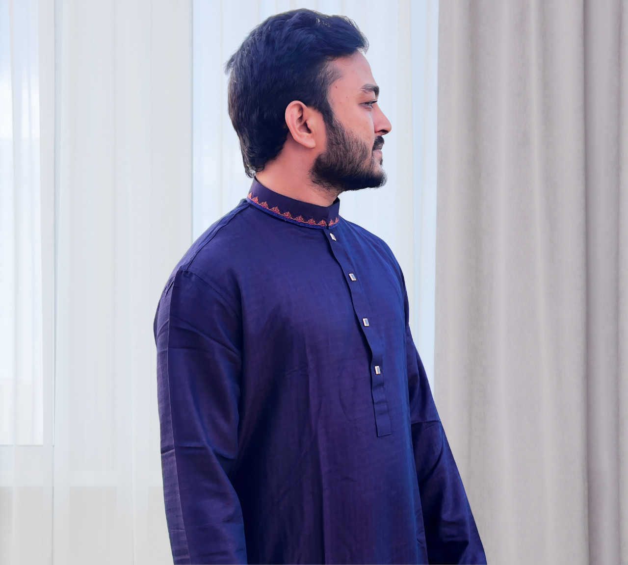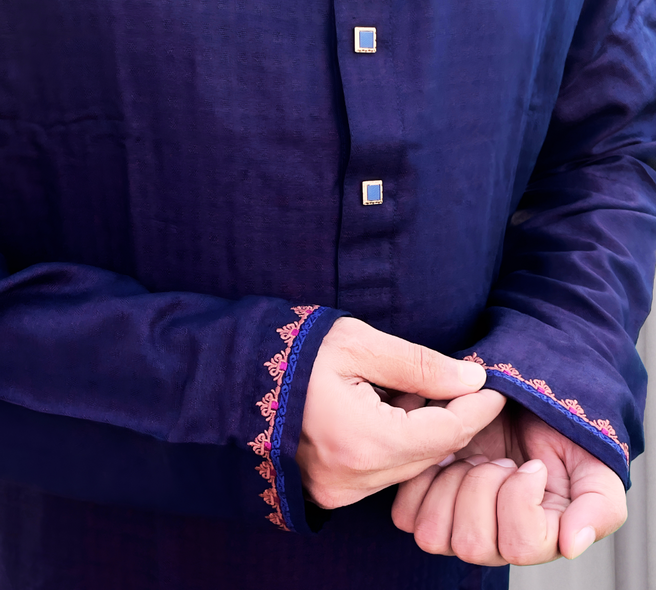 Classic Navy Blue Panjabi with Elegant Cuff Embroidery